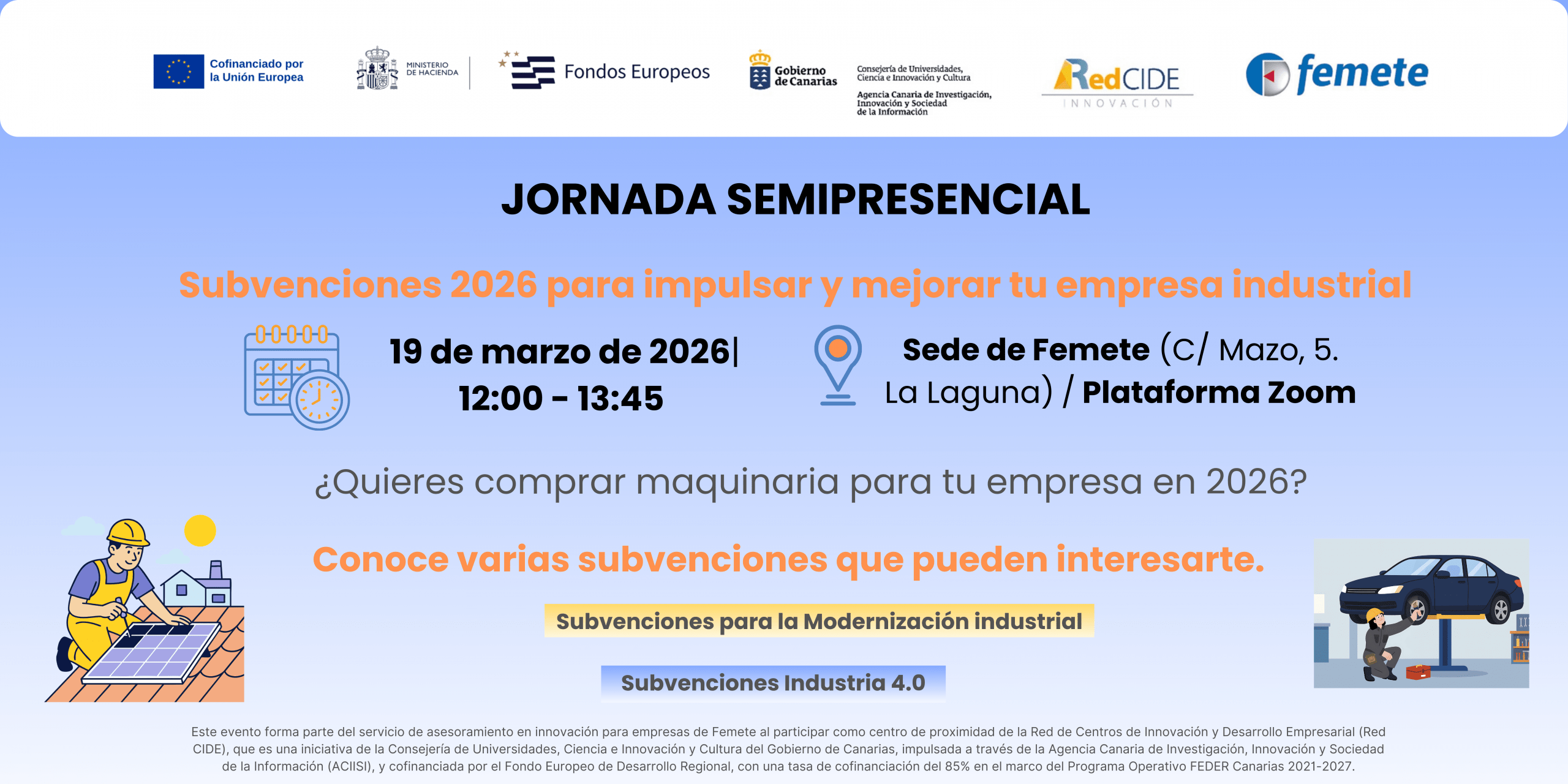 ¿Quieres comprar maquinaria para tu empresa este año? El CIDE de Femete organiza este encuentro con personal técnico de la Dirección General de Industria del Gobierno de Canarias, que nos explicará los aspectos más relevantes de las subvenciones que tiene …