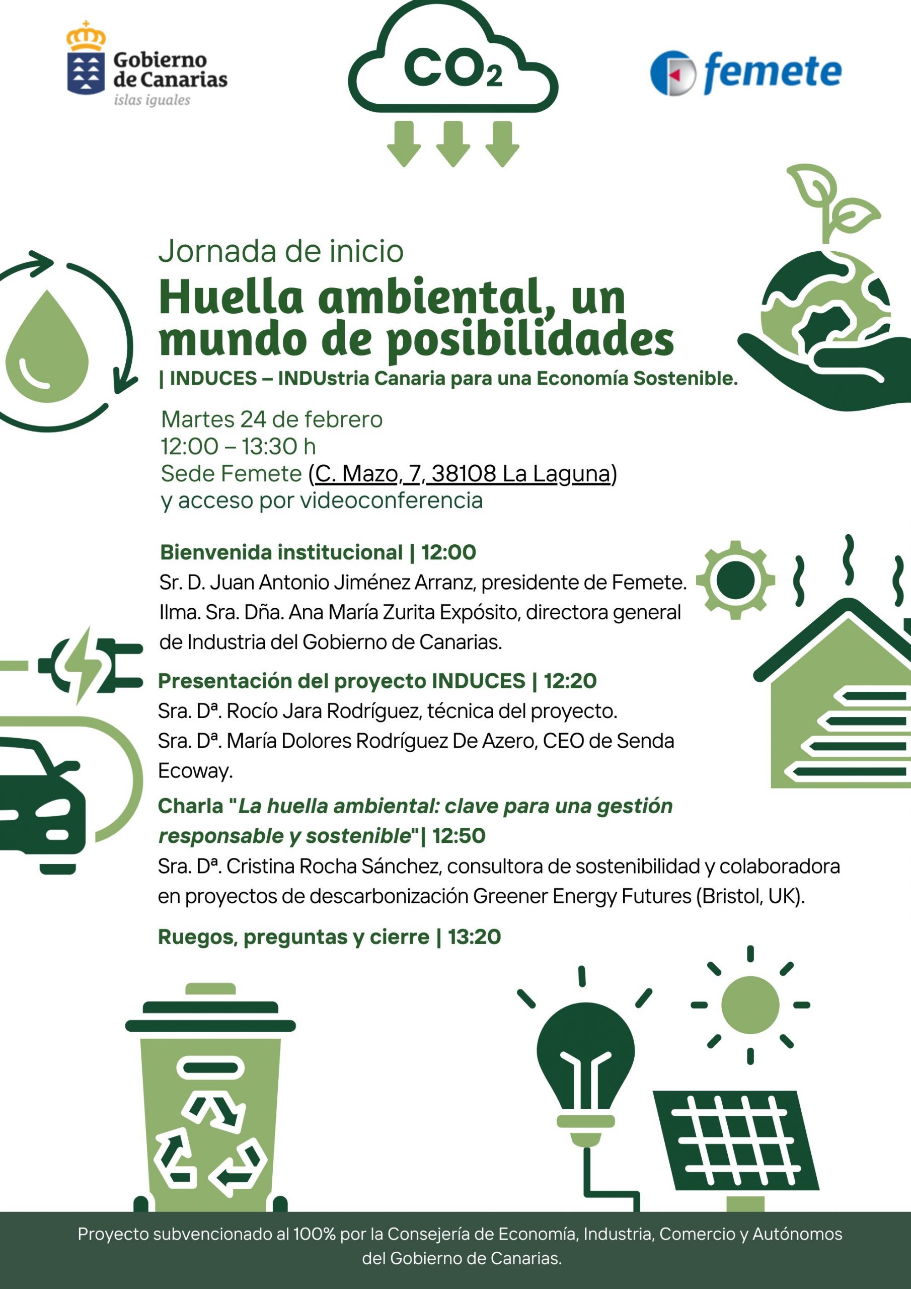 Femete organiza la jornada “Huella ambiental, un mundo de posibilidades” que servirá como inicio del proyecto InduCES (Industria Canaria para una Economía Sostenible). Este encuentro tendrá lugar el martes 24 de febrero, a partir de las 12:00 horas, en formato presencial y también online, con el objetivo de sensibilizar y apoyar al tejido industrial canario en la integración de criterios de sostenibilidad y gestión ambiental responsable.