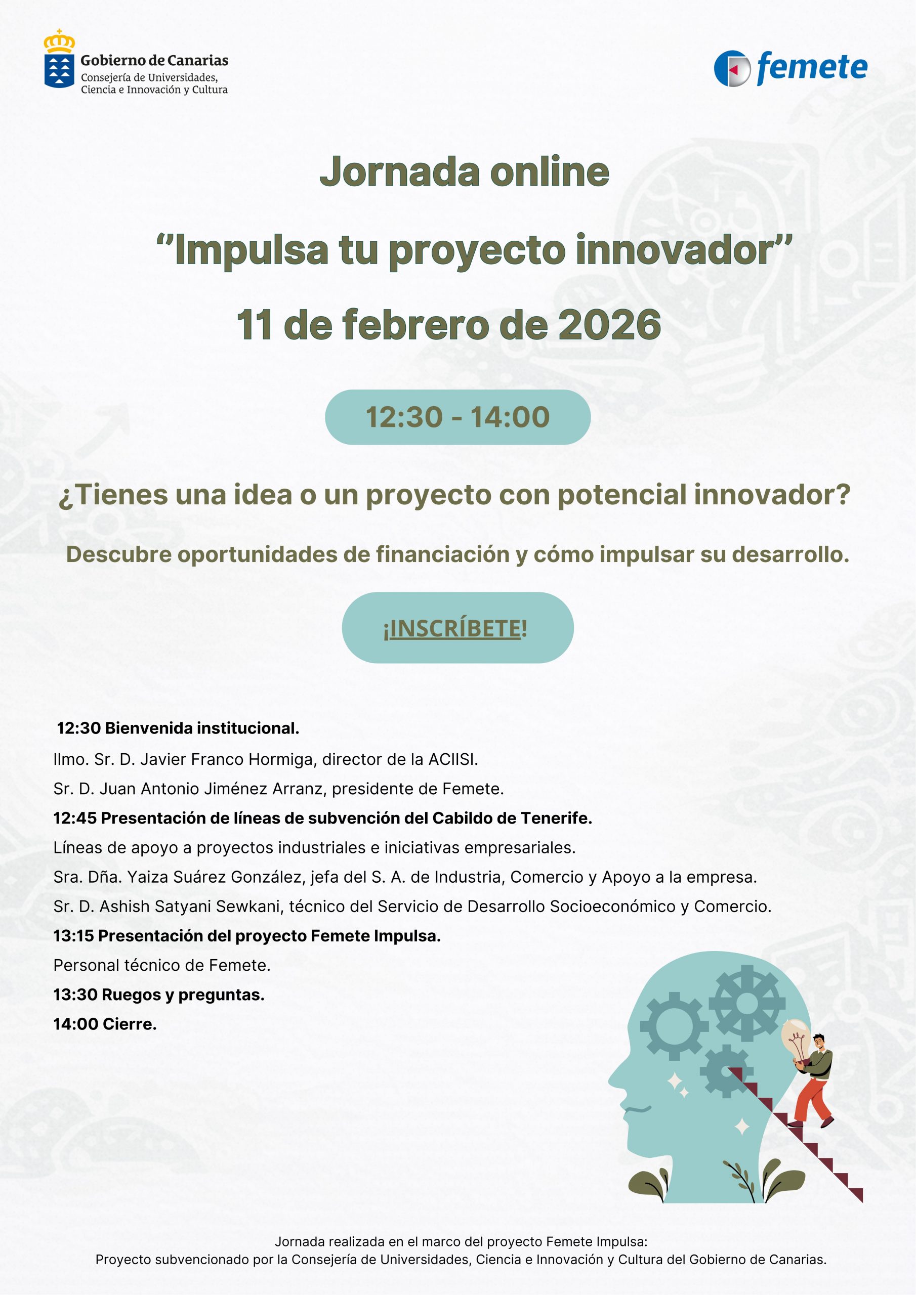 La jornada servirá para presentar, de forma clara y práctica, las líneas de subvención del Cabildo de Tenerife para este 2026 dirigidas a proyectos industriales e iniciativas empresariales. Asimismo, se dará a conocer “Femete Impulsa”, un proyecto subvencionado por la Consejería de Universidades, Ciencia e Innovación y Cultura del Gobierno de Canarias, que ofrece acompañamiento y apoyo a empresas de reciente creación o con una antigüedad máxima de cinco años —ampliable hasta siete en el caso de determinados sectores estratégicos— que desarrollen su actividad en ámbitos vinculados al metal, la industria y las tecnologías avanzadas.